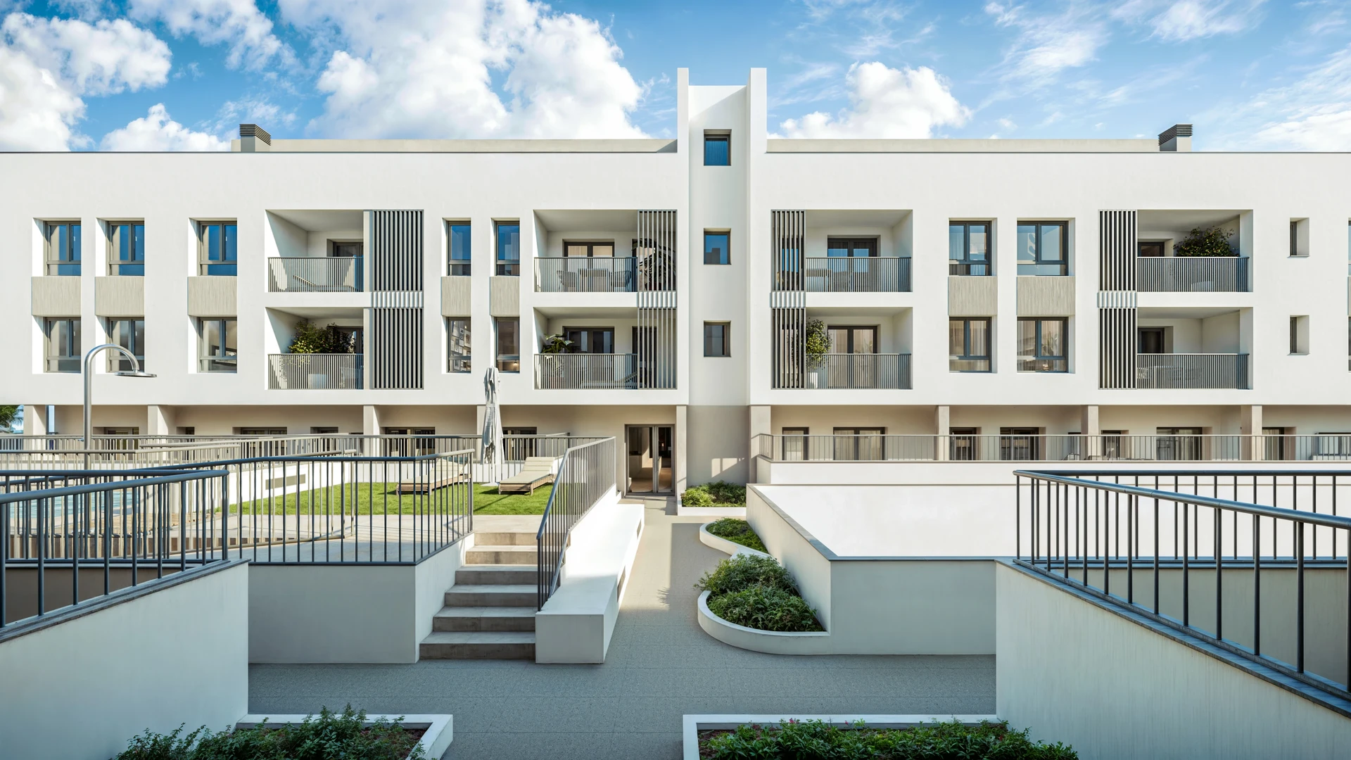 Inside the courtyard, the atmosphere shifts toward community and retreat. Circulation paths frame landscaped pockets, guiding residents through a sequence of open and sheltered spaces. The pool becomes a quiet focal point, enclosed by the surrounding volumes and animated by the sky above. Water, shadow, and sky interact with the architecture, reinforcing a feeling of openness while remaining protected.